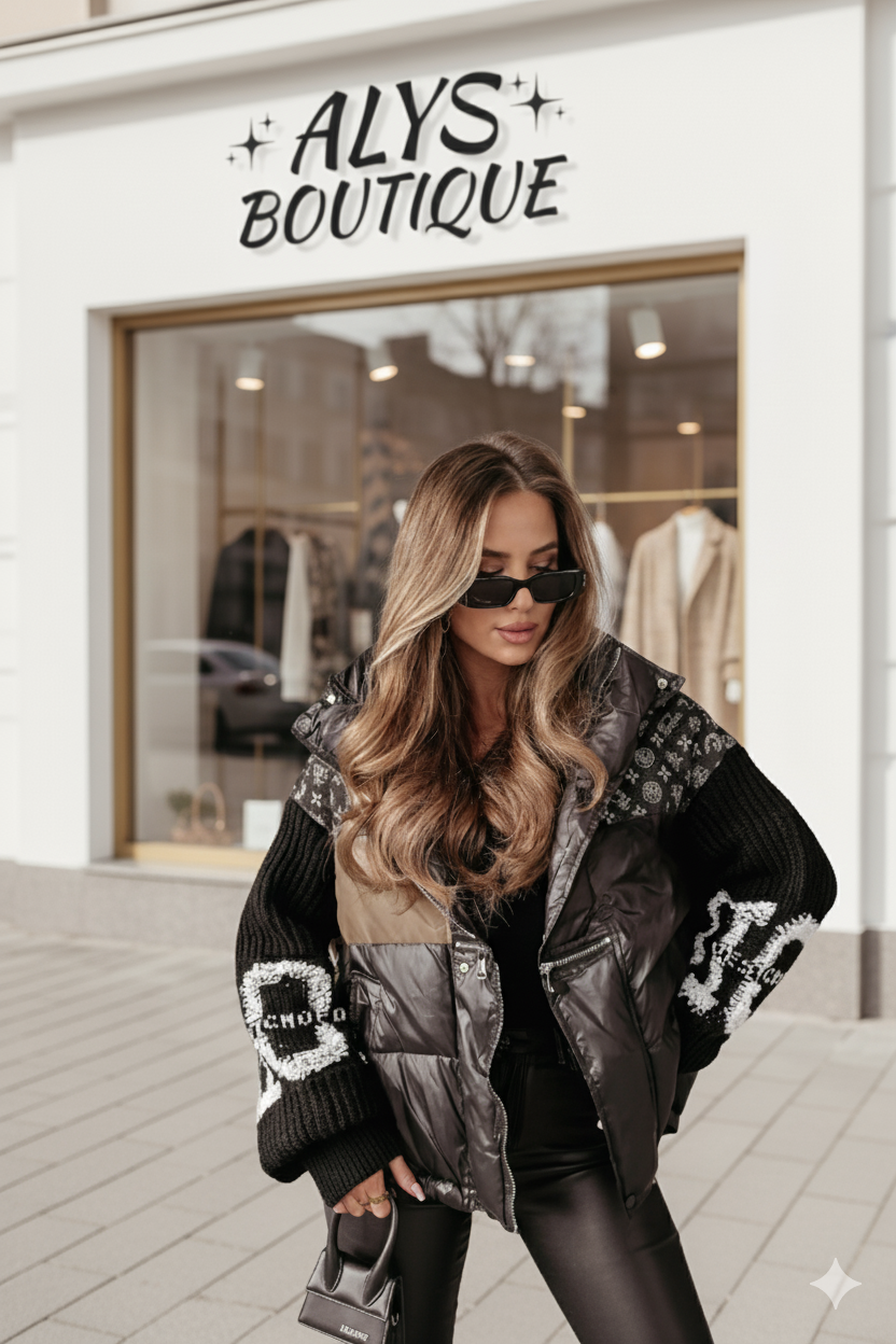 • Design ibrido – Un mix di piumino, denim e maglia che crea un look unico e distintivo.
